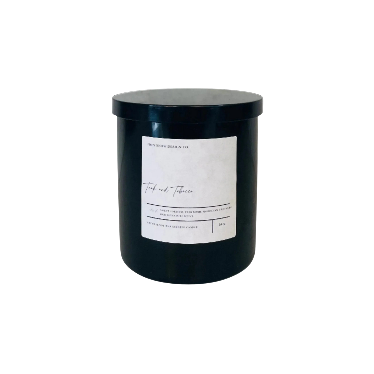 Our Teak and Tobacco scent is hand-poured here in Carlsbad, CA with all natural, non-toxic ingredients. With notes of sweet tobacco, teakwood, rain, and moroccan cashmere, it is rich in scent and great for any time of year! This is our signature scent and Joey's favorite! :)