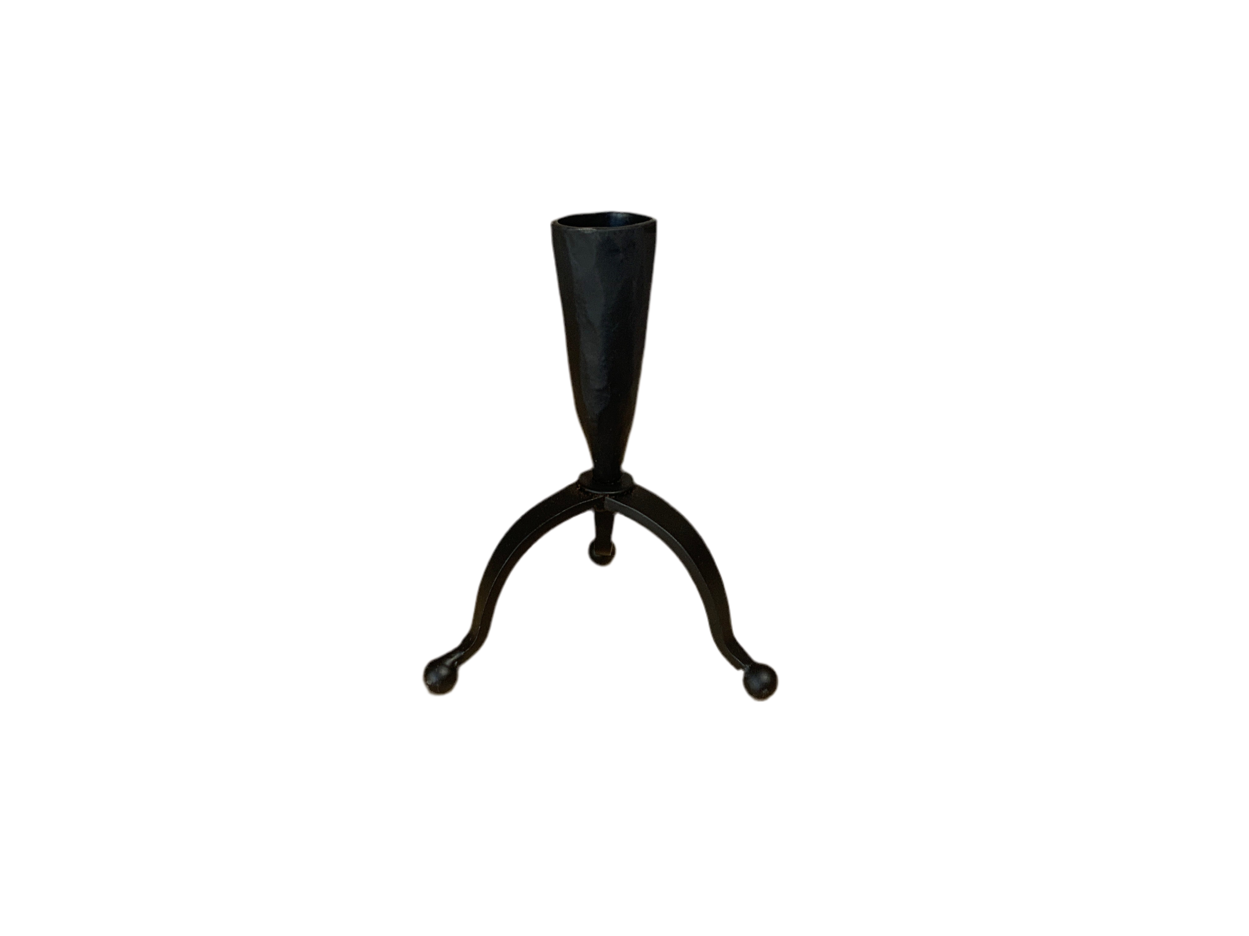 Black iron candle holder with a three legged base.