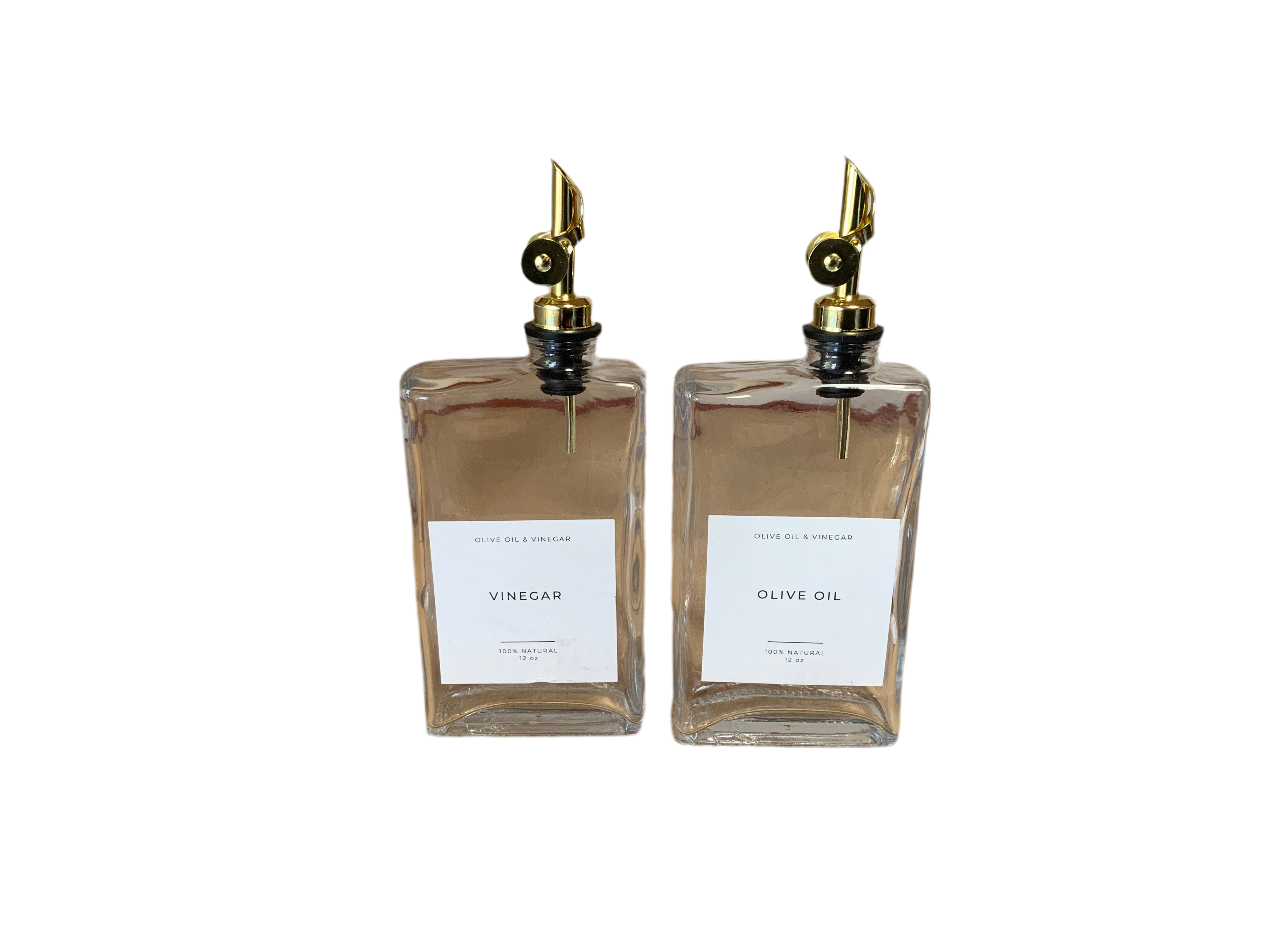 Glass oil and vinegar dispenser bottle with gold weighted pour spout. The bottle is sold empty allowing you to fill it with what you want.
