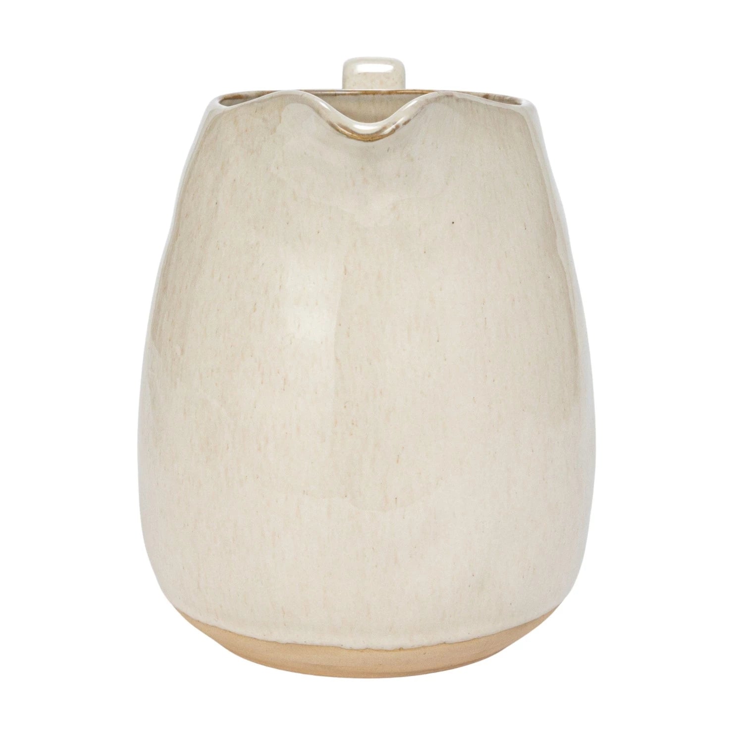 The pitcher has a round shape and a curved handle that make it easy to hold and pour. The pitcher can be used to serve water, juice, milk, or any other beverage of choice, or to display flowers, plants, or other decorative items. The pitcher is made of high-quality and durable stoneware that is easy to clean and care for. The pitcher has a capacity of 64 ounces. Add some elegance and charm to the own home or give a thoughtful gift to someone special, this stoneware pitcher with reactive glaze and cream speckles is a wonderful choice.
